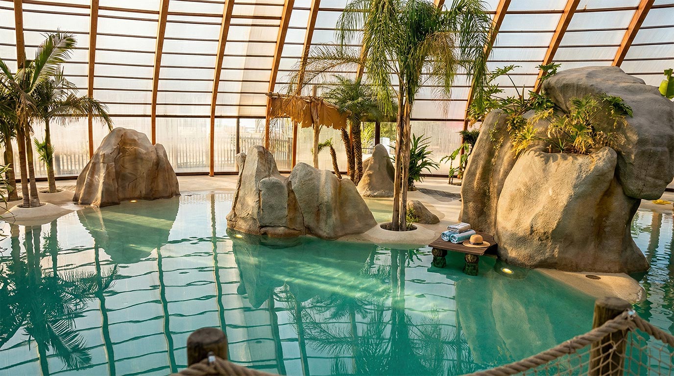 Le Pebbletec® supprime par ailleurs le besoin de margelles traditionnelles : la continuité visuelle entre plage et bassin est totale, ce qui renforce l’effet lagon naturel attendu par vos vacanciers.