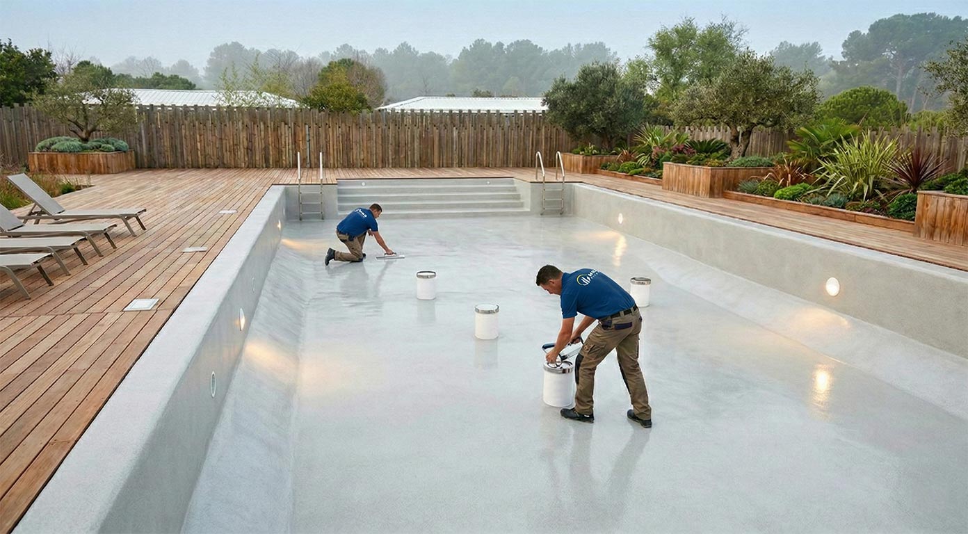 Temps de cure, puis application du revêtement choisi : Pebbletec®, mosaïque de verre, pierre naturelle. C’est à cette étape que votre bassin prend son identité visuelle définitive.