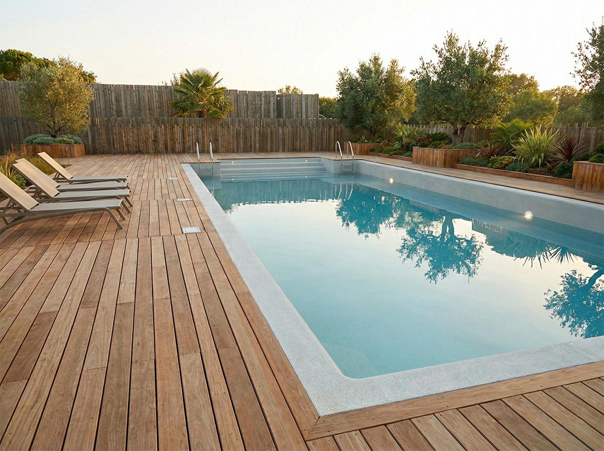La structure béton accepte les revêtements les plus exigeants : mosaïque de verre ou d’émail pour les jeux de lumière, pierre naturelle pour une intégration minérale, Pebbletec® pour un toucher doux et un rendu naturel qui dure 40 ans sans perte d’esthétique. Chaque finition raconte une histoire différente.
